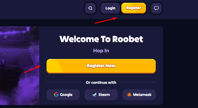 Create a new Roobet account through the sign-up page. Simply click on the Register button at the top right part of the screen.