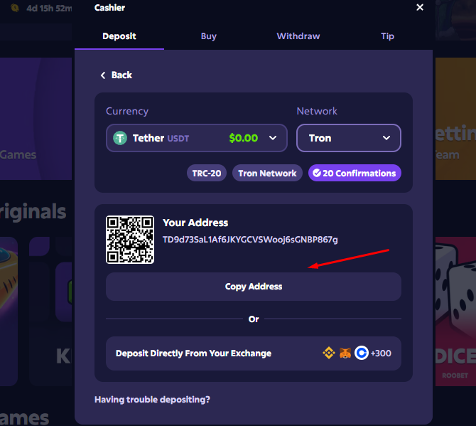 We’re going with the USDT as it’s the most convenient for us. Click on it, and then copy the wallet address from Roobet (DON’T FORGET TO CHOOSE TRC-20 NETWORK).