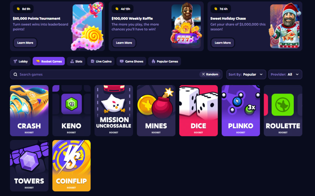 Roobet Originals are in-house games built and operated directly by Roobet using provably fair technology. These games usually have the highest or full bonus contribution, which is why most wagering and rewards apply here first.