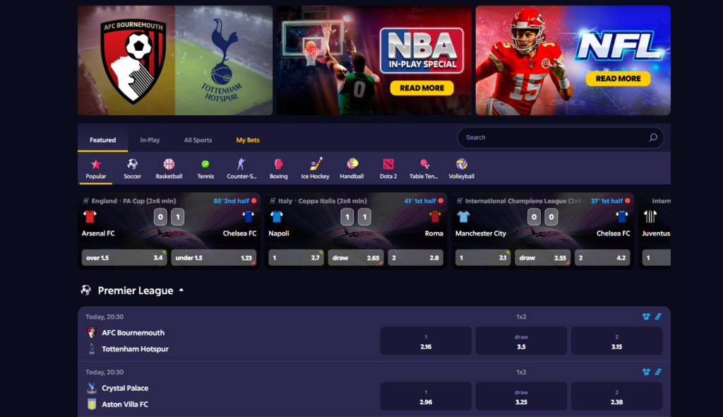 The sportsbook includes soccer, basketball, tennis, MMA, cricket, ice hockey, and esports, with leagues from over 50 countries. Live betting is available across major markets, but bonus eligibility varies by bet type and odds.