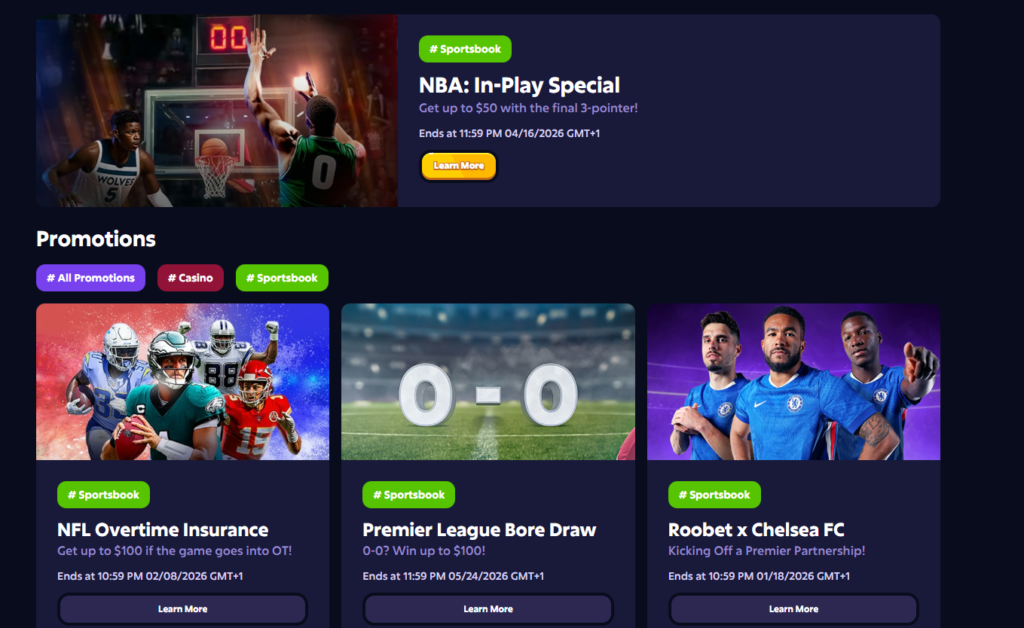 If your NFL bet goes to overtime, Roobet refunds part of your stake. This promotion protects you from narrow outcomes where a game runs longer than expected. It’s a safety net, not a multiplier, which makes it useful for regular NFL bettors.